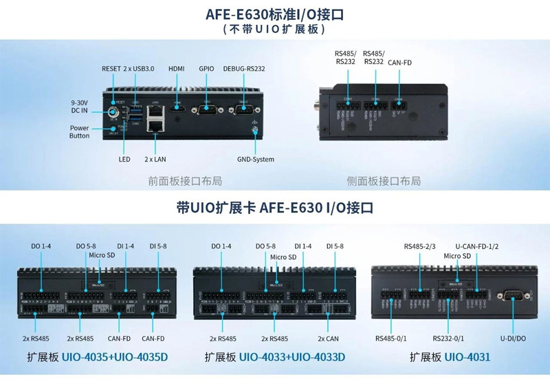 工商儲場景中邊緣智能系統需連接多種設備,因而豐富的接口至關重要。AFE-E630提供2 x RS232/R485, 1 x CAN FD, 6 GPIO,并可通過UIO靈活擴展,最高支持4 x RS485,2 x RS232,2 x CAN FD,8 x DI,8 x DO。根據應用需求,可選隔離/非隔離接口設計。同時,支持4G/GPS/Wi-Fi/BT/NVME/SD選配,靈活適用不同場景。