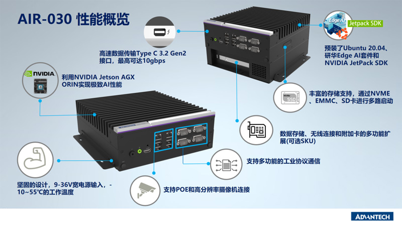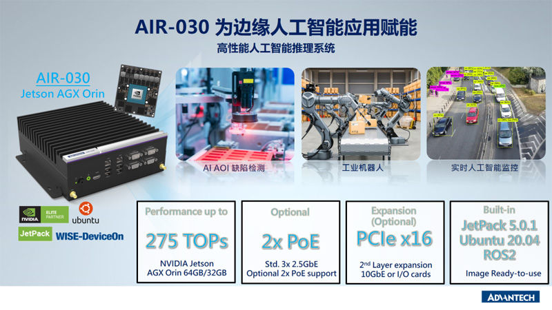 研華的AIR-030邊緣推理系統(tǒng)由最新的NVIDIA Jetson AGX Orin提供支持,可提供高達(dá)275 TOPS算力。此外,它還支持多個傳感器的高速接口,這些優(yōu)勢,使其成為下一代AI機(jī)器人的完美選擇。