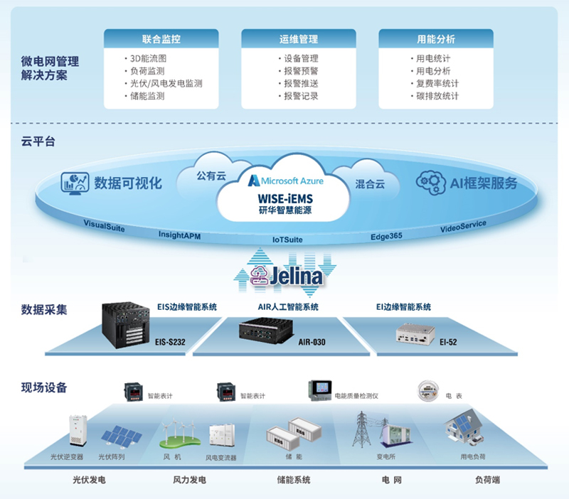 研華具備強大的軟硬整合能力,基于研華標準物聯網Jelina平臺進一步延伸定制了適用于新能源行業的能源Jelina方案,該方案能幫助客戶高效部署,實時云端管理設備狀態,涵蓋了災難恢復、遠程監控、無人值守等功能,幫助解決行業痛點,確保儲能系統長期穩定運行。此外,作為微軟合作伙伴,研華提供靈活安全的Azure云服務,幫助儲能邊緣端設備數據無縫上云,實現安全、敏捷、高可用、低時延、隱私保護的大數據和人工智能服務與應用。
