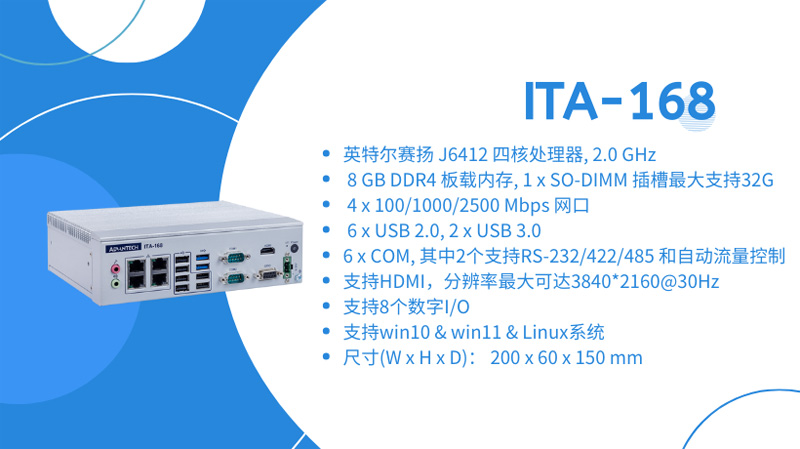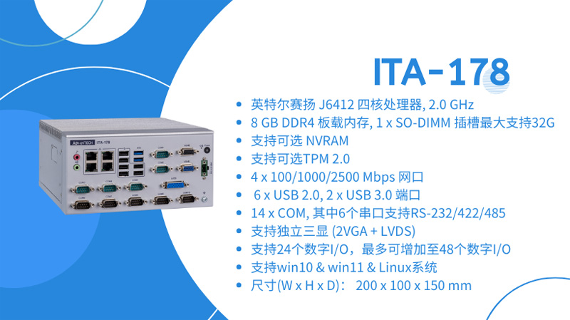 研華智能交通ITA-1000系列再上新品,ITA-168 / ITA-178基于英特爾賽揚Celeron J6412低功耗處理器,性能強勁,運行穩定,支持雙通道內存,可同時兼顧板載以及內存條擴展需求。