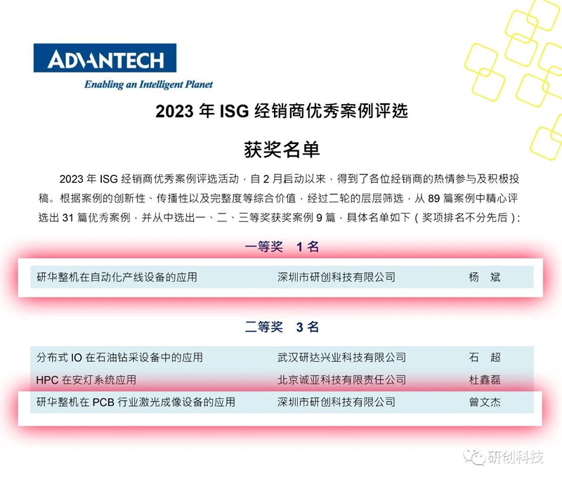 研華2023年ISG經銷商優秀案例評選活動,從2月啟動開始,全國各地的經銷商們熱情參與,積極投稿。根據案例的創新性、傳播性以及完整度等綜合價值,經過二輪的層層篩選,從89篇案例中精心評選出31篇優秀案例,并從中選出一、二、三等獎獲獎案例9篇,我司員工楊斌、曾文杰在此次活動中分別獲得一、二等獎!