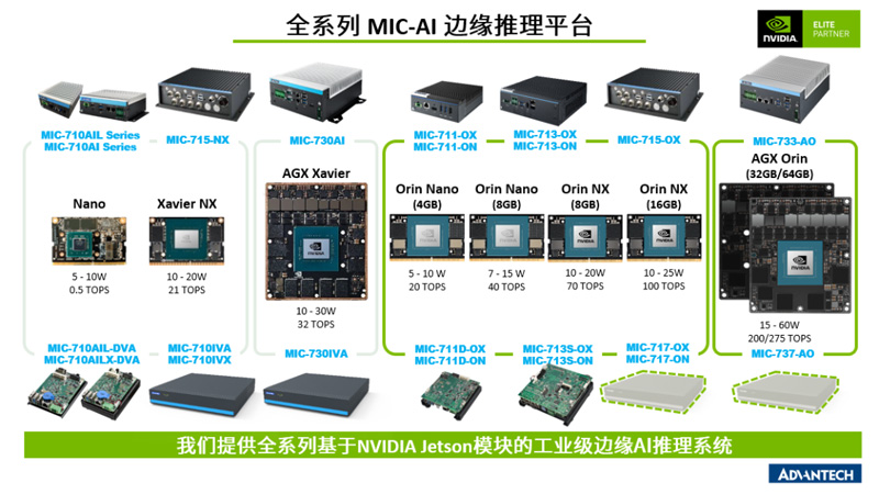 研華是英偉達Elite Partner (精英合作伙伴),為滿足客戶需求,應對邊緣運算端的一系列垂直應用的挑戰。研華推出了MIC-AI全系列產品,提供Jetson全系列平臺系統,包括了新型 Jetson Orin 、Jetson Xavier™ NX、Jetson AGX Xavier™、Jetson AGX Orin™、Jetson Nano™以及Jetson TX等。
